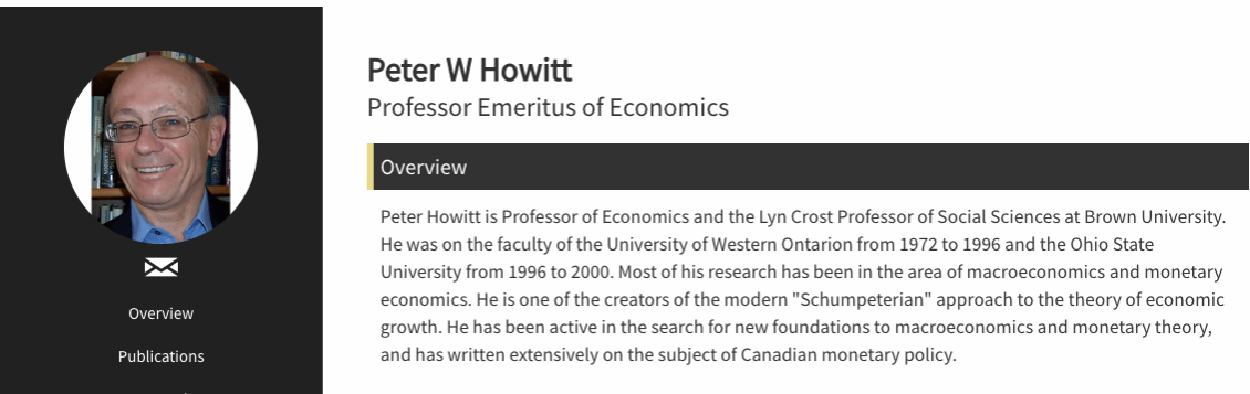 Peter Howitt,美国布朗大学经济学教授,其研究主要集中在宏观经济学和货币经济学领域,致力于为宏观经济学和货币理论寻找新的理论基础,并在加拿大货币政策领域发表了大量研究成果。以下为其在布朗大学官网的介绍: