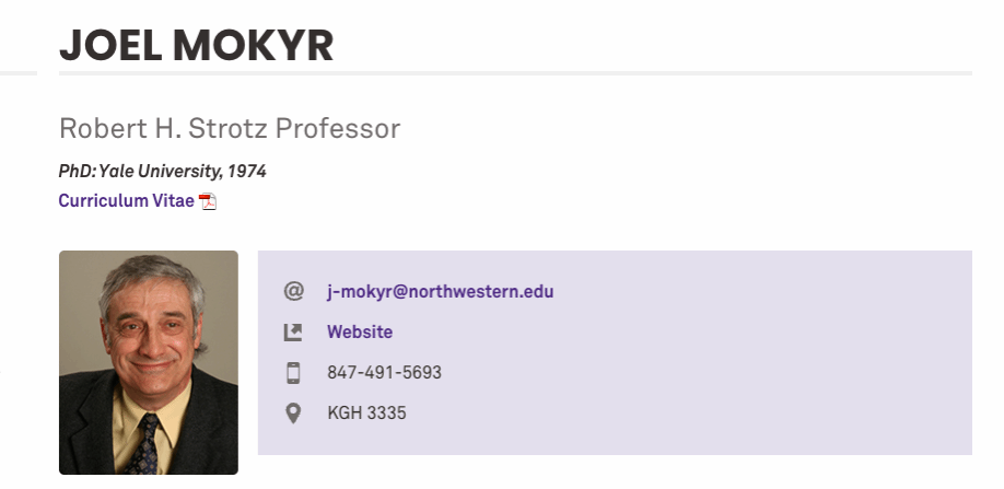 Joel Mokyr,美籍以色列经济学家与历史学家,主要从事欧洲经济史研究。他目前的研究关注欧洲社会技术进步及有用知识增长的经济与智力根源,以及工业化和经济进步对经济福利的影响。以下为其在美国西北大学官网的介绍: